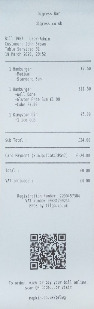 Once paid, a ‘Status’ will appear, followed by the receipt which will also indicate the Order# number. The Status will show either the position in queue, if “Table Service” was selected, or wait time for “Collection” or “Delivery”. The address bar will also change to display a case-sensitive unique URL for the order, e.g. napkin.co.uk/pVBwg.