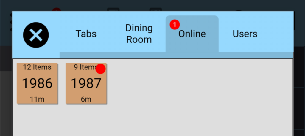 Select the “Tab” icon, followed by ‘Online’. This will show all the currently active open tabs from Napkin with the associated Order# number. A red notification dot will appear on any tab that has not yet been opened by a user