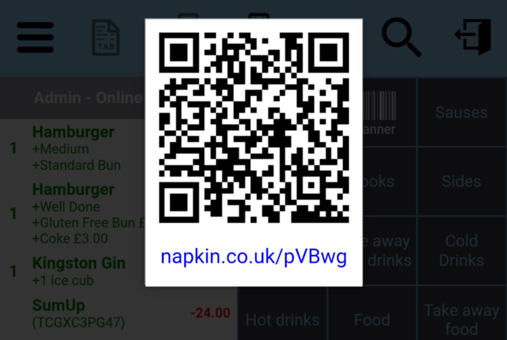 A QR Code icon, brings up the same unique URL, that the customer was shown on Napkin.co.uk after the payment of the order. Furthermore the URL is also present on the email and printed receipt.