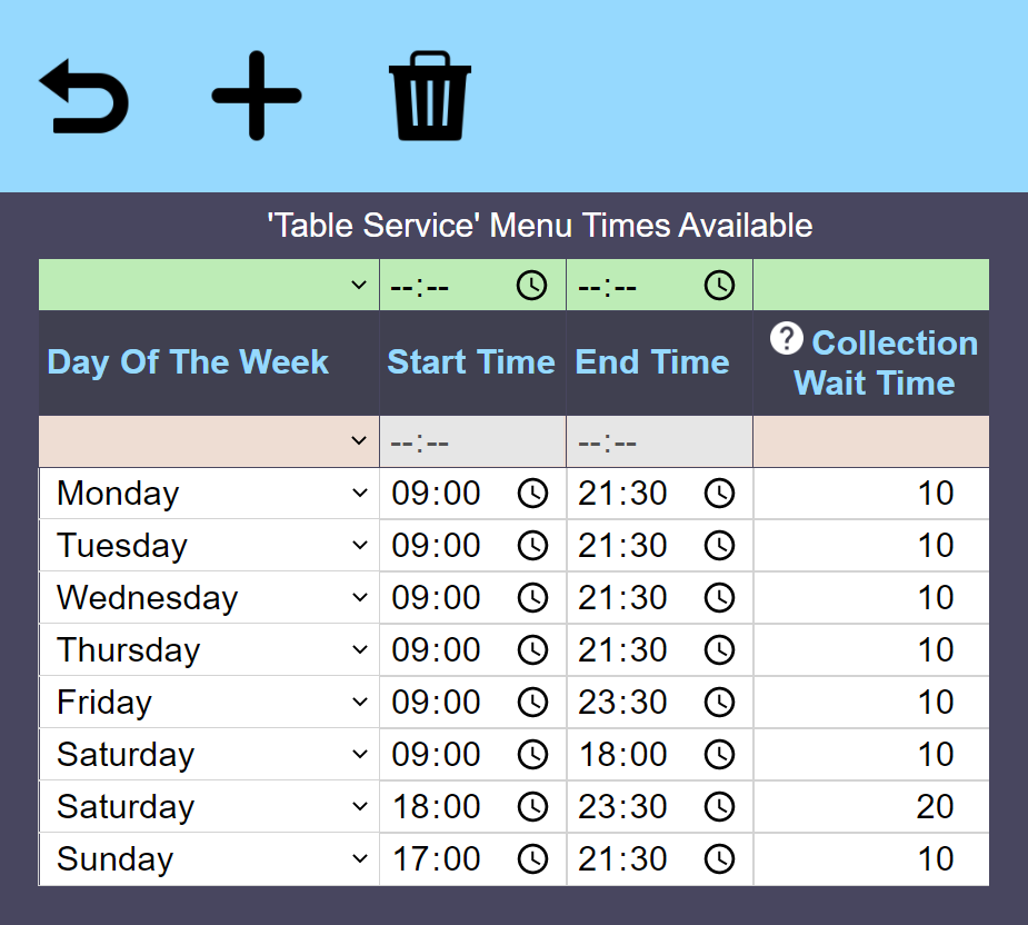 Select for a given menu to enter the times that your customers can place orders on just that menu, using the and to add and remove rows.