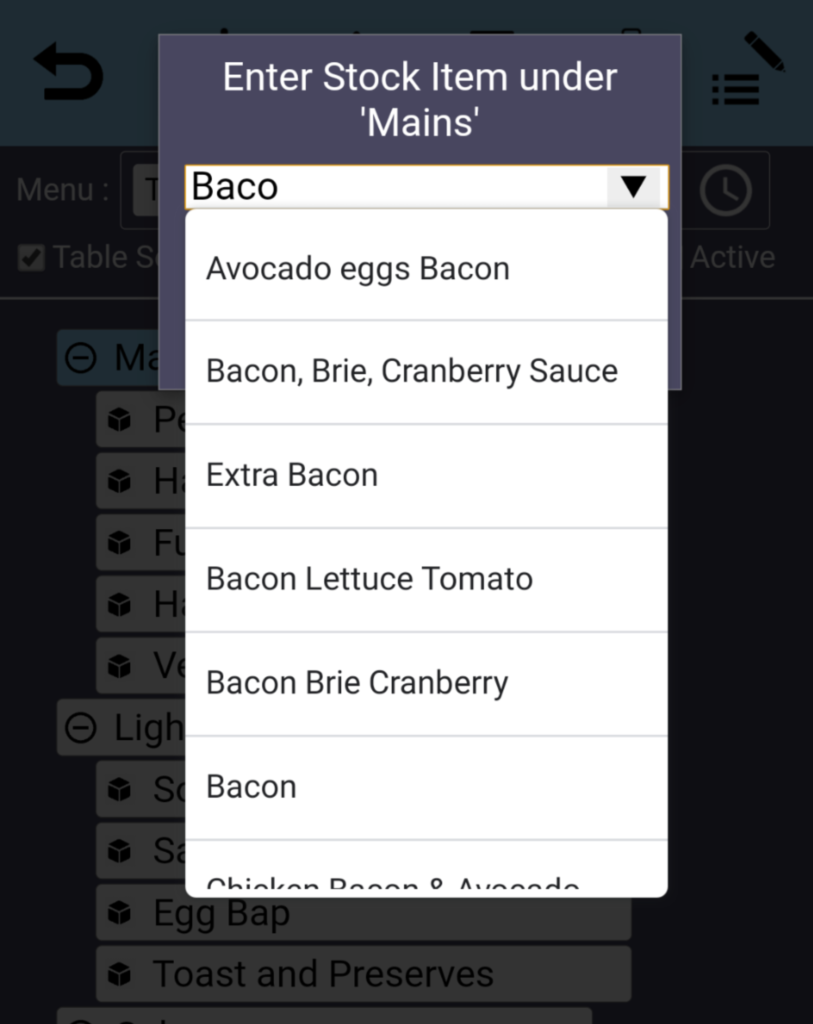Lastly you will need to add a Stock Item to the menu category for it to appear on the online ordering portal, and this would be done by pressing . A popup box will now appear, with a dropdown list of all the Stock Items available to add. You type to narrow down the list.