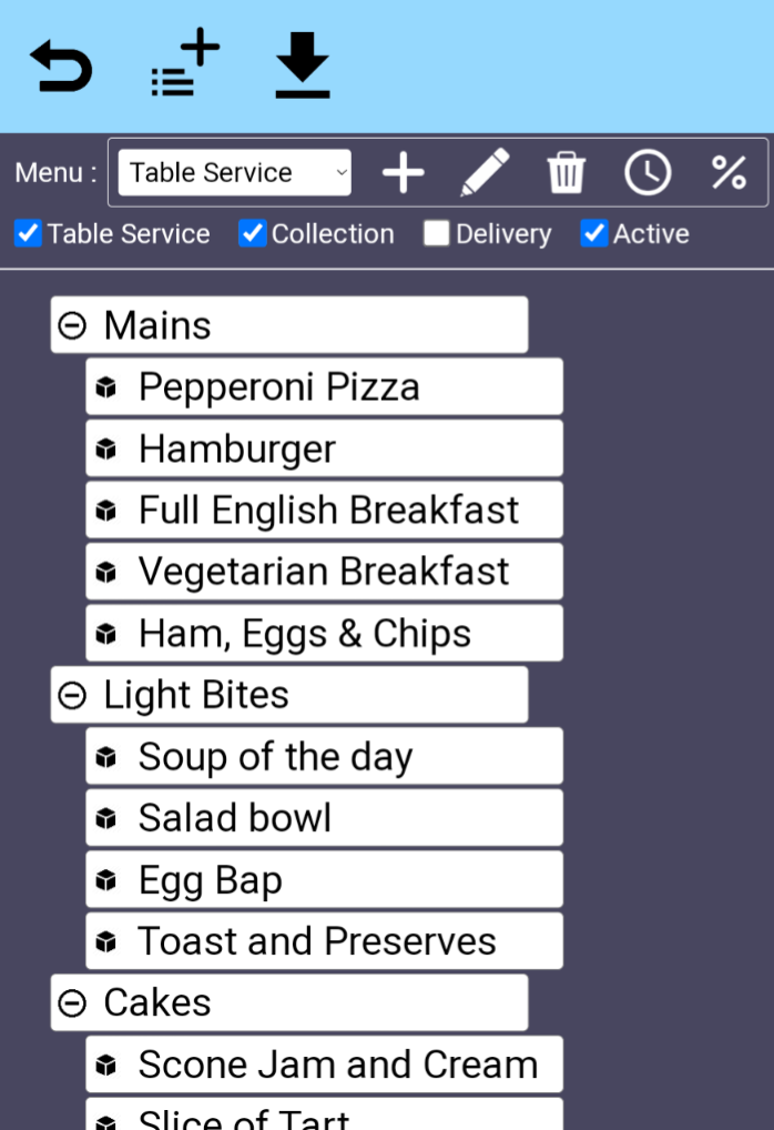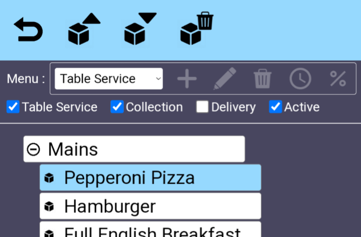 Under <Back Office><Online Menus> it is possible to define multiple menus that your customers can see when using the online ordering portal. You could create a “Table Service” menu, or a “Take Away” menu or a “Sunday Lunch” menu for example. First select the appropriate menu you want to edit using the dropdown next to the word “Menu” In the example below it is “Table Service”. However to create a completely new menu use on this same row. Similarly changes the name of the menu, and will delete the menu.