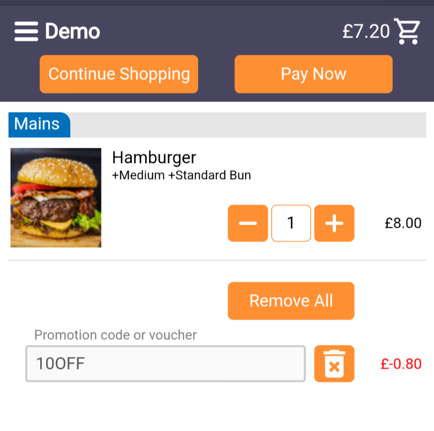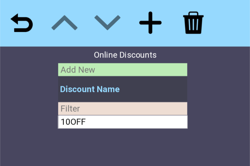 Select the % icon for a given ‘menu’ to enable a discount code that your customers can use when placing online orders. Use the and to add and remove discounts. Discount Codes can be created by selecting Back Office > Discounts
