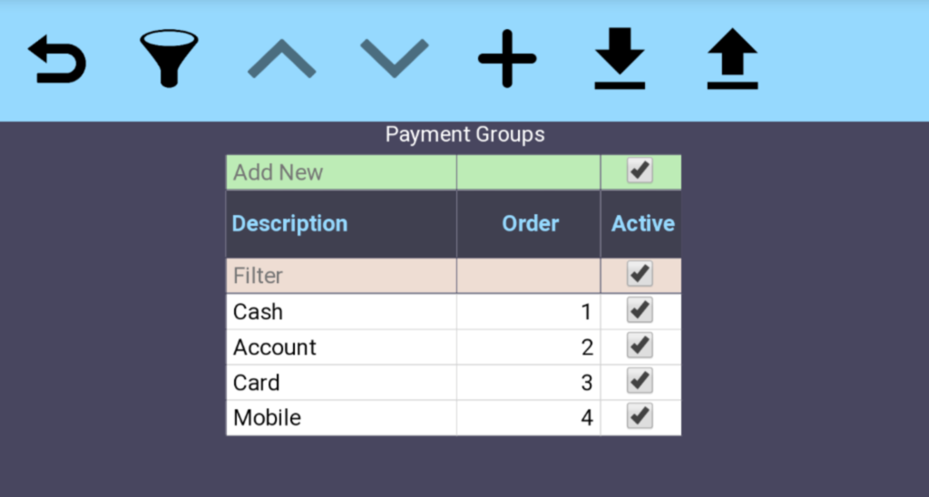 Start first in the <Payment Group> section. This allows you to define the different types of payments, eg card, mobile, cash etc. There are already some default ones set up. This is used for reporting purposes.