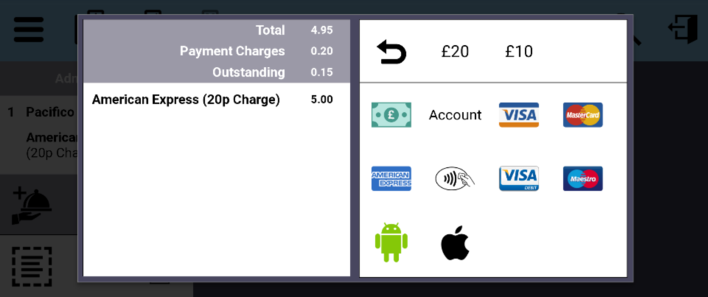 Till Unit Price” allows you to specify is there is a charge for using a certain payment type. eg in the example above “American Express” has been set with a 20p charge. The charge is added to the bill, whenever “American Express” is selected during the payment process of settling the bill: