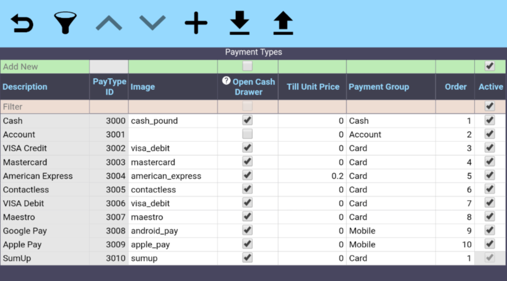 Active: You can remove a Payment Type so it does not become an option on cashing out a Tab , by unticking this field.