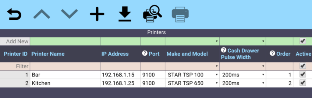 Once you have entered all your printers, select the button. You should now go to the <Device Setup> section again, to define the device’s “Network Receipt Printer”, and whether orders are printed.