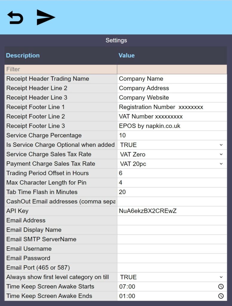 Time Keep Screen Awake Starts/End : When on the till screen, Napkin will prevent the screen from going off during the times specified here. If End Time is before start time, it will be at the time the following day. If you Start Time equals End Time, the screen will always remain on.