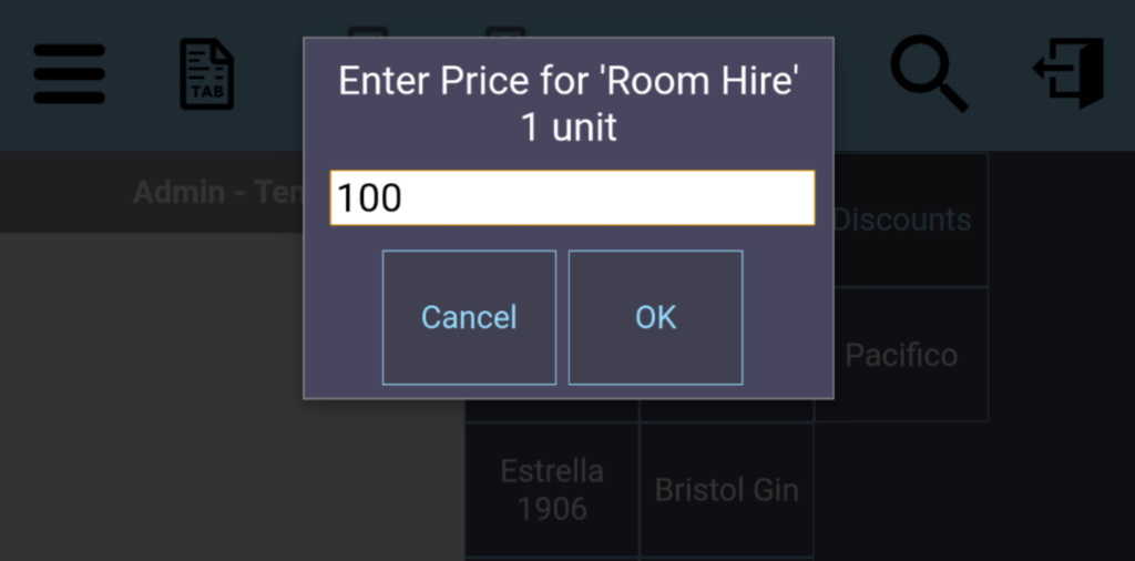 • Price Variable. Size Fixed : When you select the item on the main till, a popup box will ask you every time for the price. e.g. as shown below. The quantity for inventory management is set by ‘Till Volume/Till Units’.
