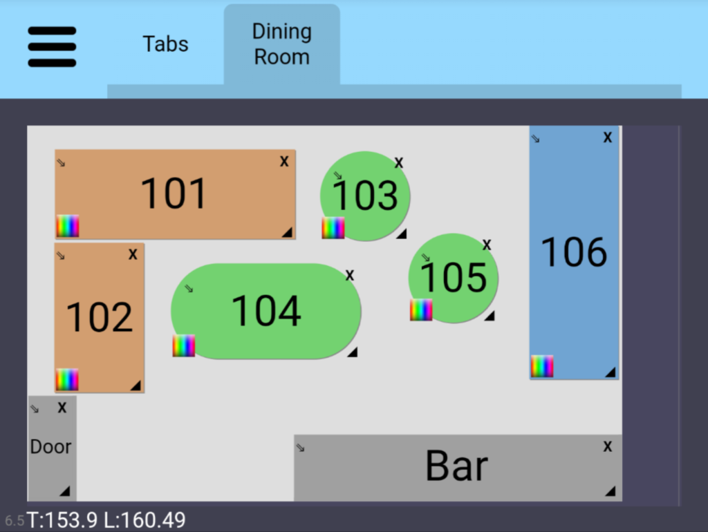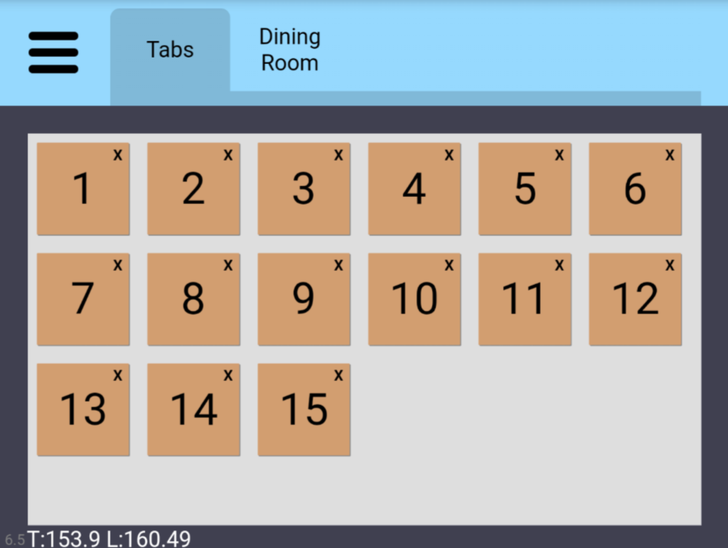 Tabs are placed on the screen in a grid in one standard size and one colour. You may want to use this for “Bar Tabs”, where you give the customer a token, and they come up to the bar to order, showing the waitress the token of their Tab.